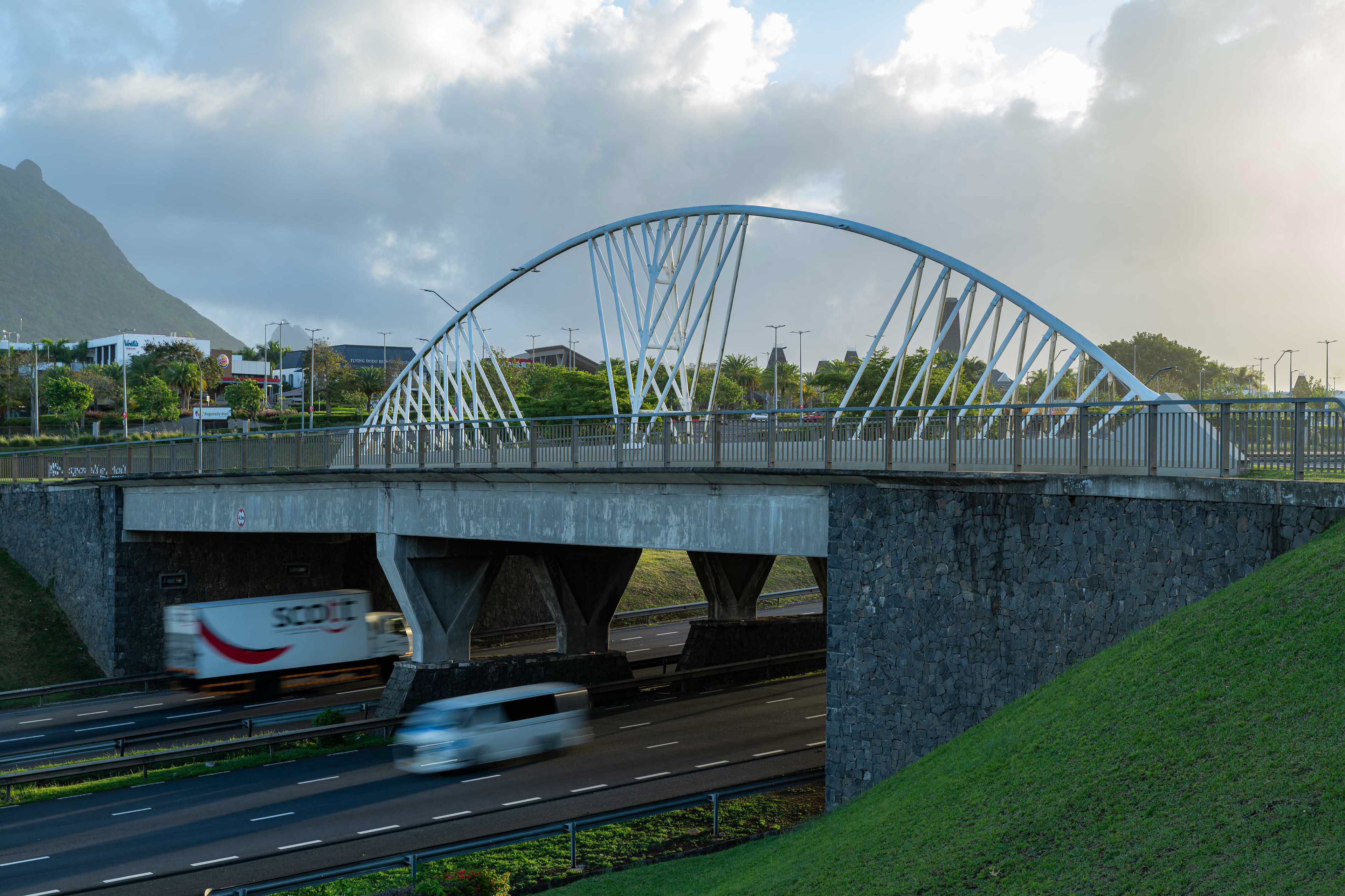 The Bagatelle Bridge is a key infrastructure project supporting the development of the Bagatelle Mall of Mauritius. Constructed by a consortium composed of Rehm Grinaker Construction Co. Ltd and Cogir, the project was developed under the leadership of ENL Property in partnership with South African firm Atterbury. Designed with elegant steel arches and illuminated at night, the bridge stands out as a distinctive architectural landmark. Its construction required significant investment and engineering expertise to improve connectivity between major roadways and allow seamless access to the new commercial and residential developments, including the Mall, Motor City, and future business spaces. The Bagatelle Bridge marks a major milestone in the transformation of this area into one of Mauritius’s most dynamic urban hubs.