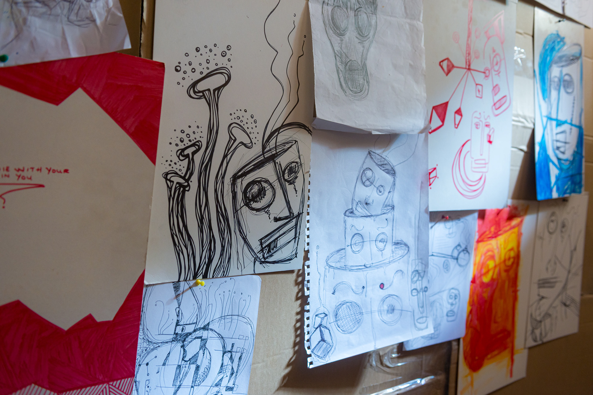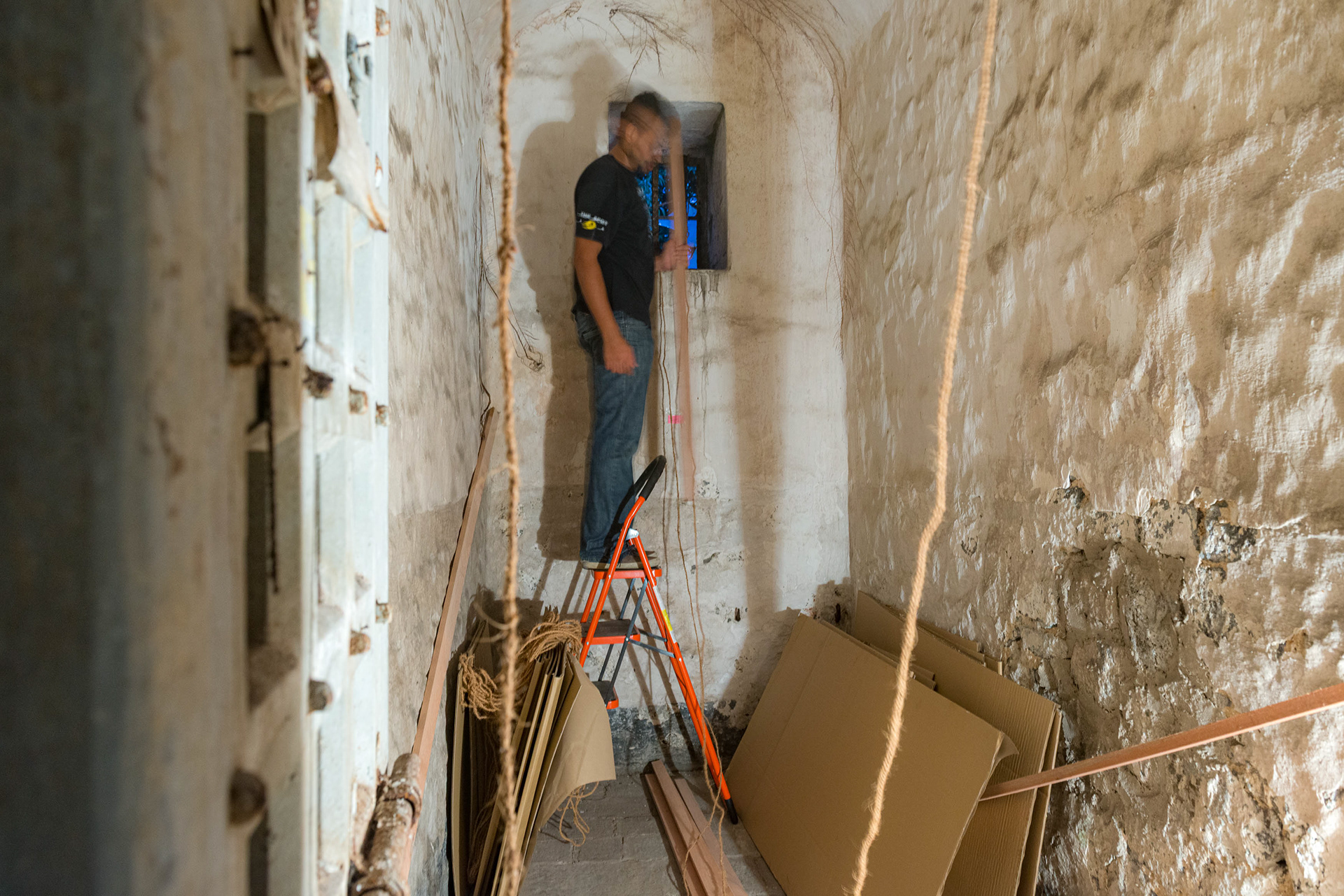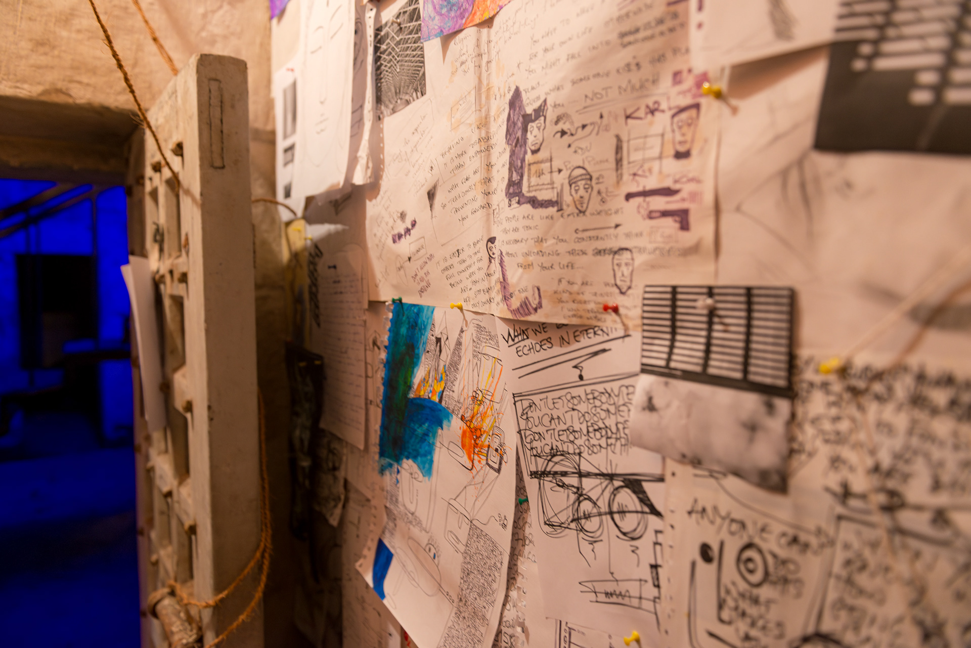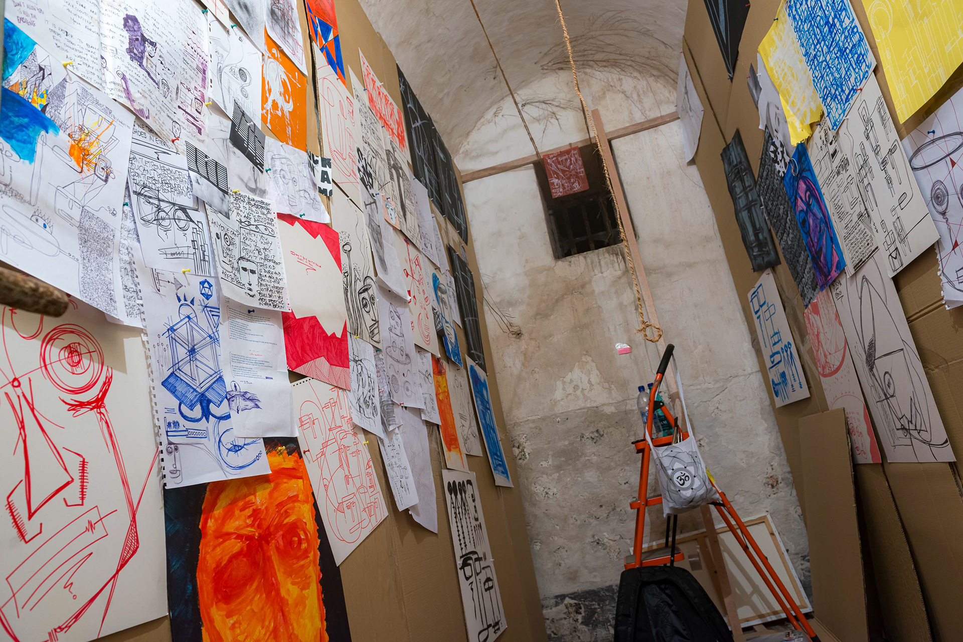 ÉVASION - Porlwi by Light 2015. Un groupe d’artistes est sélectionné pour investir la vieille prison de la capitale. Un lieu chargé d’une atmosphère d’abord inquiétante, puis étrangement rassurante. Un.e artiste, une cellule, et une semaine pour s’approprier moins de dix mètres carrés. Pendant sept jours, ma cellule devient un atelier. Bienvenue dans ma tête — cet endroit qui peut parfois sembler être une prison, se transforme: les murs deviennent des canevas ; chaque image, une pensée, une émotion, un combat qui construit l’évasion. Les photos et les dessins se relient par des morceaux de ficelle. Les connexions se tissent et se forment, comme un nouveau réseau de neurones. Dans un monde qui cherche désespérément à nous dire qui nous sommes : une communauté, une couleur de peau, un accent, un passé, un héritage, une croyance... Être libre, c’est sans doute accepter de se voir, et de voir l’autre, dans sa complexité, dans ses incohérences. Être libre, c’est exister dans cette lutte qui devient danse, au cœur d’un monde qui va trop vite.